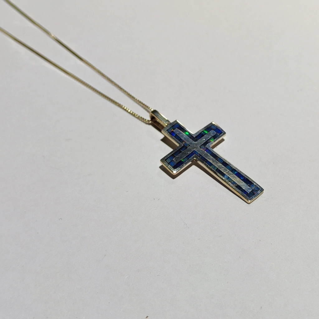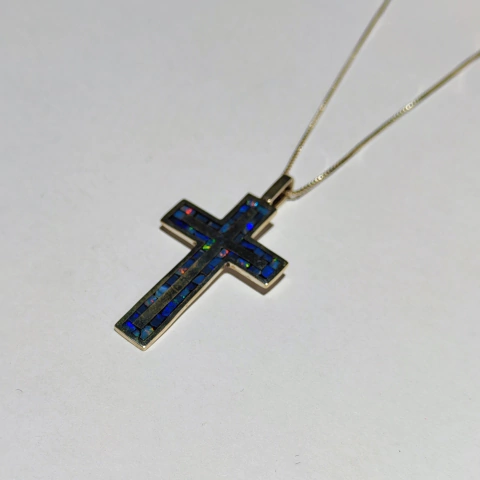 Em prata com aplicativo de mosaico de opala. Com 5cm de altura.